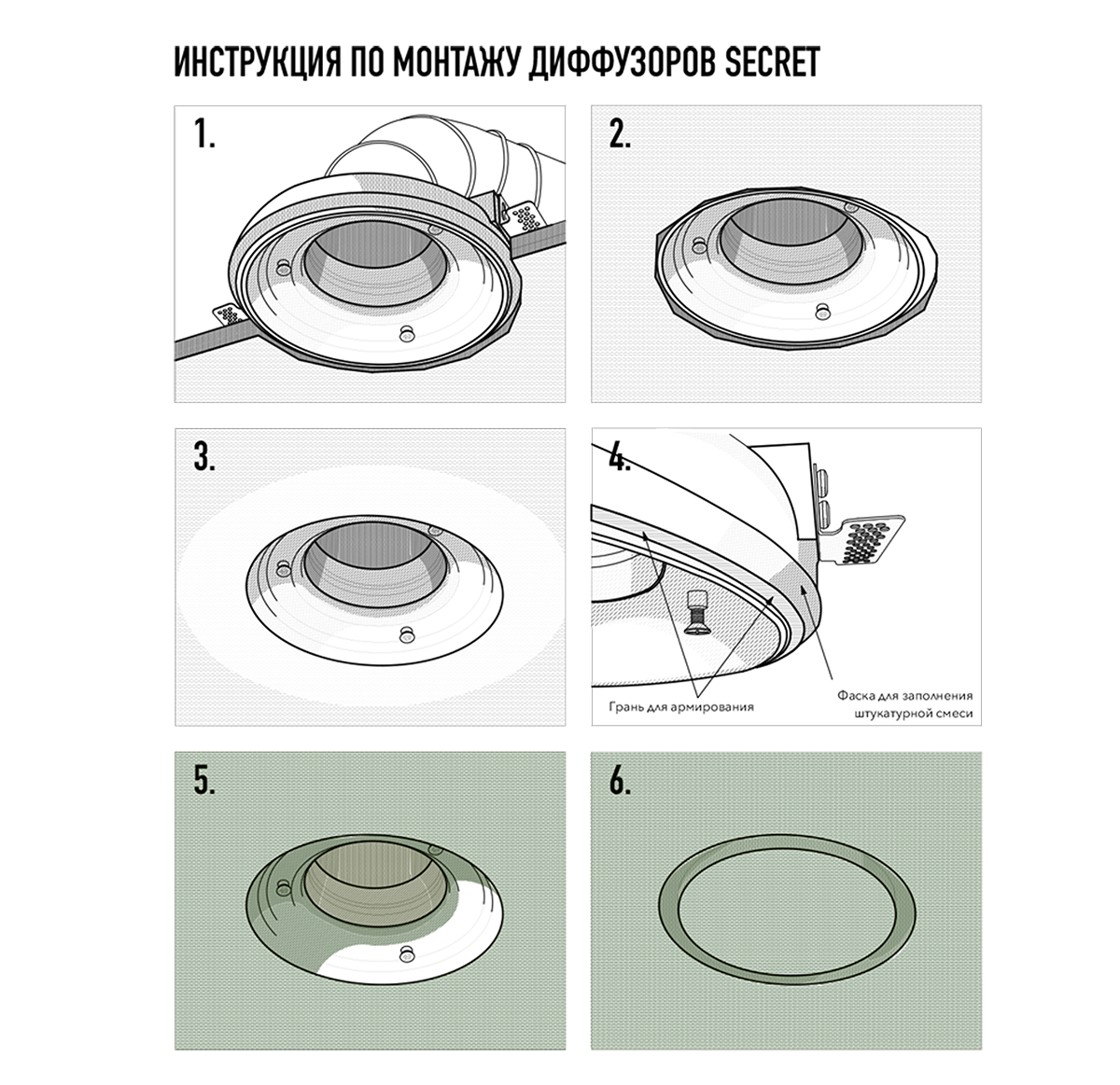 Дизайнерские диффузоры SECRET являются частью вентиляционной системы. Выполнены из гипсополимера, корпус диффузора монтируется в потолок или стену из гипсокартона, после покраски становится с потолком одним целым. Это поистине элегантное решение, сохраняющее функцию. Форма диффузоров позволяет принимать поток воздуха из вентиляционной трубы и плавно распределять его в помещение. Легко и герметично стыкуется с стандартными вентиляционными трубами диаметром 100, 125, 160 и 200 мм.